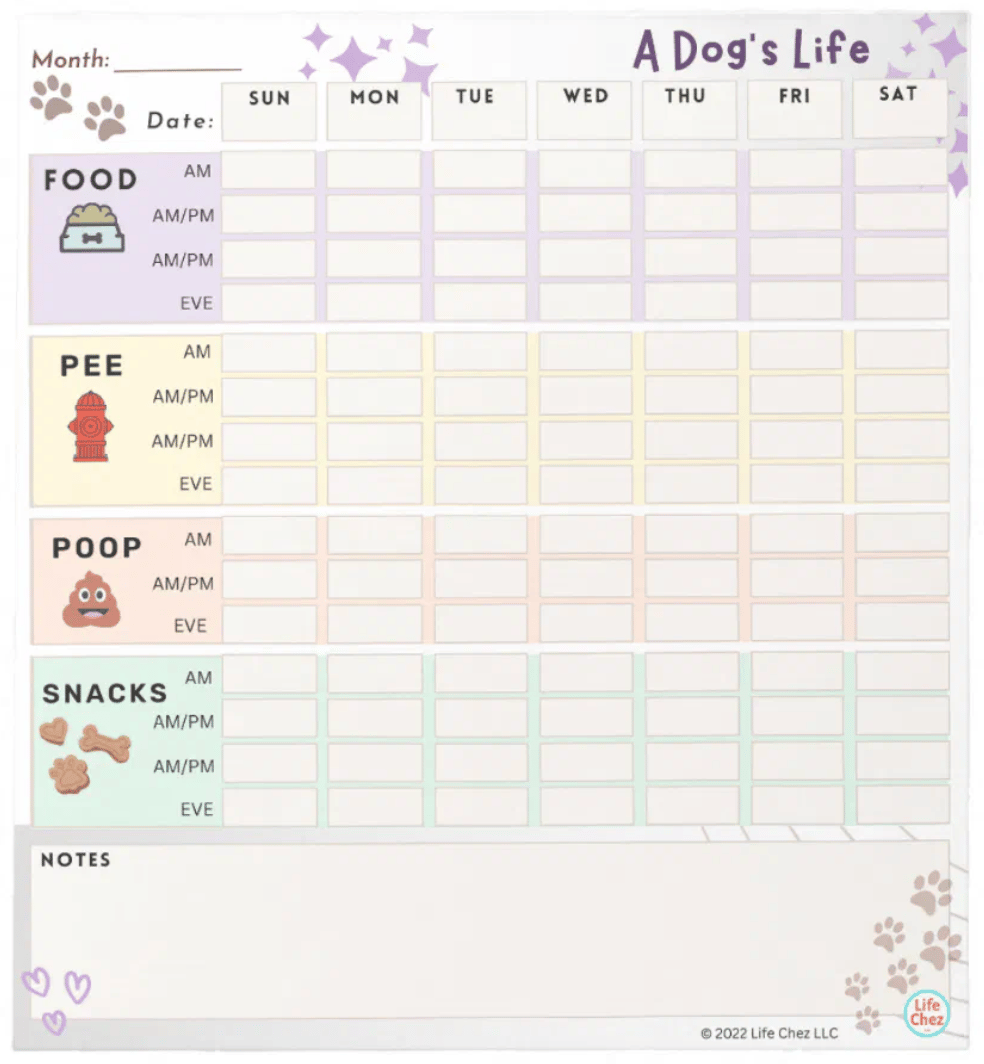 This simple log helps you track feeding times, walks, meds, and training goals so your days feel more like a smooth stroll, not a mad dash. You can find reusable dry-erase versions or printable planners on Etsy and Chewy.